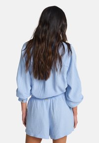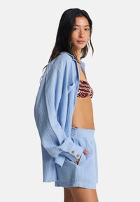 Vaaleansininen, ryppyinen, ylikokoinen paita, jossa on käännetyt hihat, yhdistetty samaa sarjaa oleviin shortseihin. Alla burgundinpunainen ja kerma-valkoinen kukkakuvioinen bandeau-toppia.