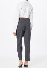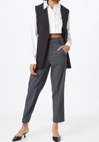 Nainen, joka käyttää korkevavyötäröisiä harmaita räätälöityjä housuja, joissa on etutaitokset, yhdistettynä valkoiseen pitkähihainen lyhyt puseroon ja mustiin matalakorkoisiin kenkiin.