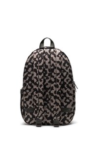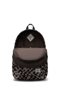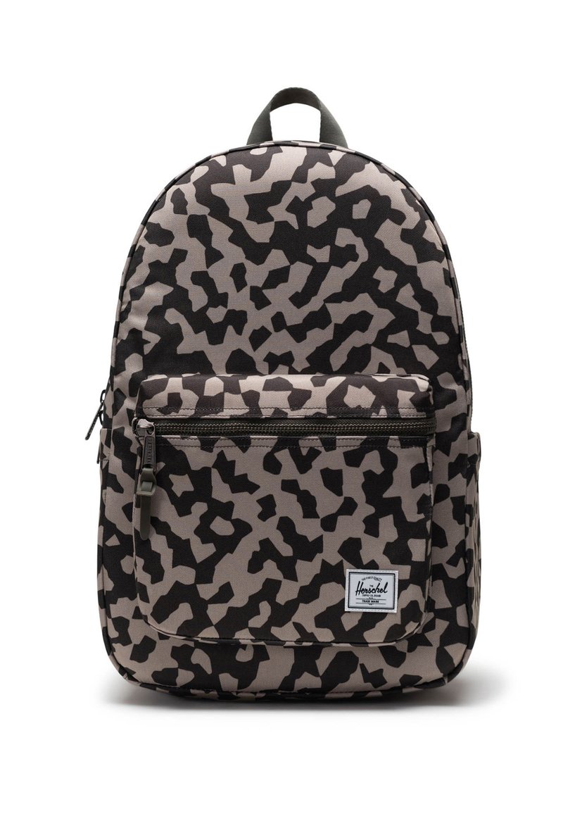 Herschel-reppu harmaassa ja mustassa abstraktissa kamouflagekuviossa, jossa on etuvetoketjullinen tasku ja kangassilmukka päällisessä.