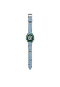 Digitaalinen kello, jossa on turkoosi muovikotelo ja valkoinen hihna, jossa on värikkäitä dinosauruksen kuvioita. Näytössä näkyy digitaalinen aika, päivämäärä ja painikkeet.