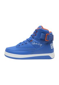 Punaiset korkeavartiset lenkkarit, jotka on valmistettu synteettisestä nahasta. Ne sisältävät mustat yksityiskohdat, pehmustetun kauluksen ja tarrakiinnityksen turvallista istuvuutta varten.