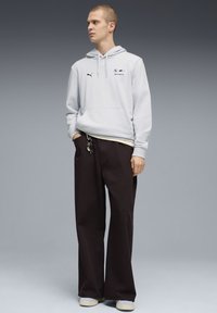 Harmaa huppari logo-yksityiskohdilla, etutaskulla ja kiristysnauhalla, yhdistetty löysiin mustiin housuihin. Vaaleat kengät täydentävät asun.