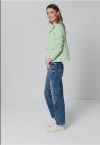 Nainen, joka käyttää vaaleanvihreää tikattua takkia, jossa on läppätaskut, valkoisen paidan ja sinisten farkkujen päällä, seisoo yksiväristä vaaleanharmaata taustaa vasten.