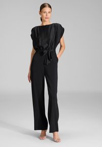 Mustat haalari, jossa on satiinipinta, leveä pääntie, lyhyet hihat, vyöllinen vyötärö ja leveät lahkeet.