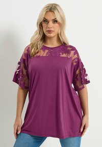 Mustapaita, jossa on verkkomaiset hihat kukka-ompeluksella, pyöreä kaula-aukko, pehmeä kangas, rento leikkaus ja vaihteleva tekstuuri.